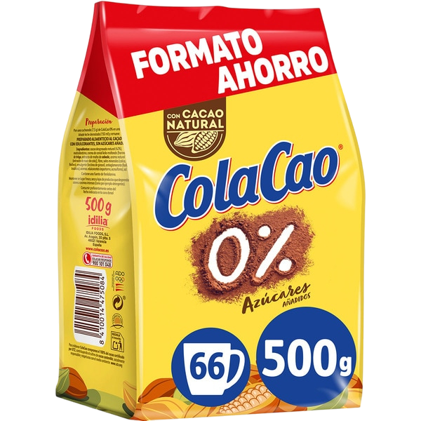 Colacao 0% en polvo de 500 g, una opción sin azúcares añadidos para disfrutar del clásico sabor del cacao. Perfecto para quienes buscan una bebida con menos calorías sin renunciar al sabor. Su fórmula dietética aporta energía natural para el desayuno o la merienda. Disponible ahora en tu Primaprix más cercano.